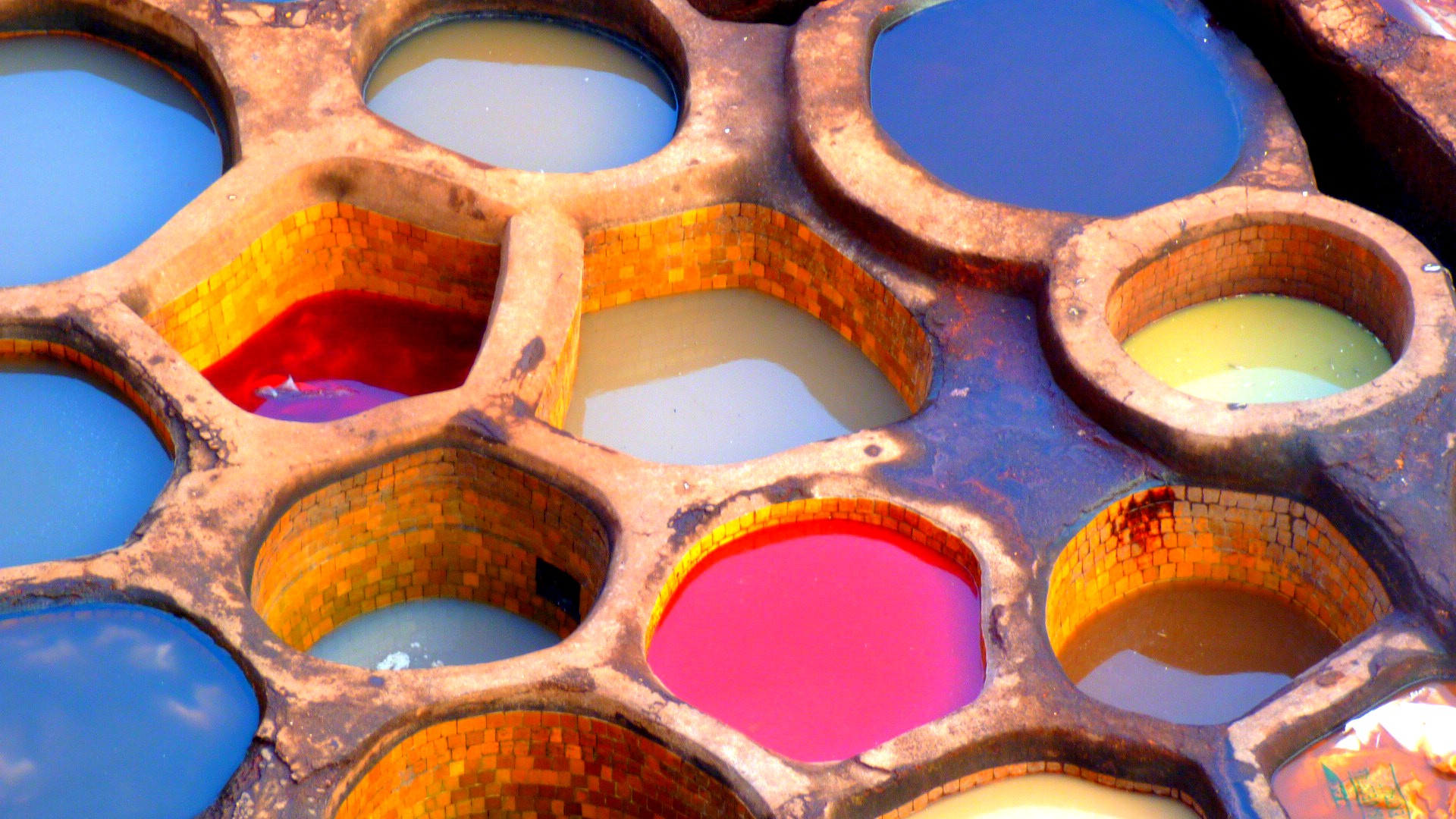 Tras aquella demostración, empezamos a subir escaleras hasta llegar a la esperada azotea, donde pudimos contemplar por fin los curtidores. Preciosas circunferencias de colores que utilizan para teñir las pieles y dar así color a los productos que hacen con ellas.