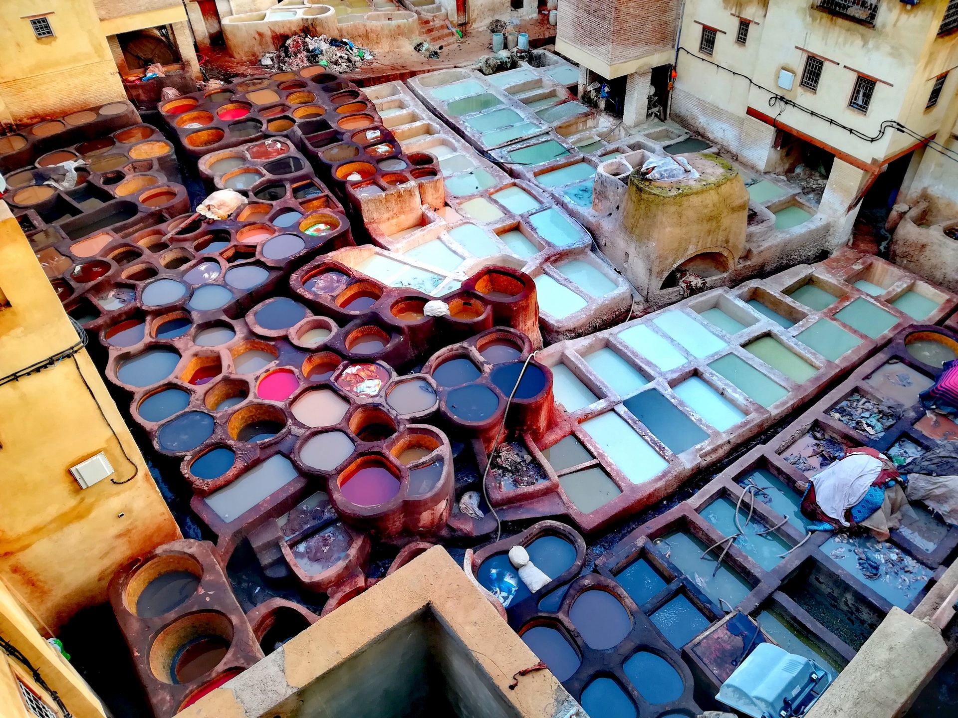 El hombre que nos seguía acompañando nos empezó a explicar el proceso de las pieles, y el tiempo que lleva prepararlas y teñirlas, un trabajo de casi más de cinco meses. Desde arriba se podía observar las pieles tendidas y metidas en diferentes curdidores de colores, también las había que se estaban secando o apiladas para su tratado o fabricación de algún producto.