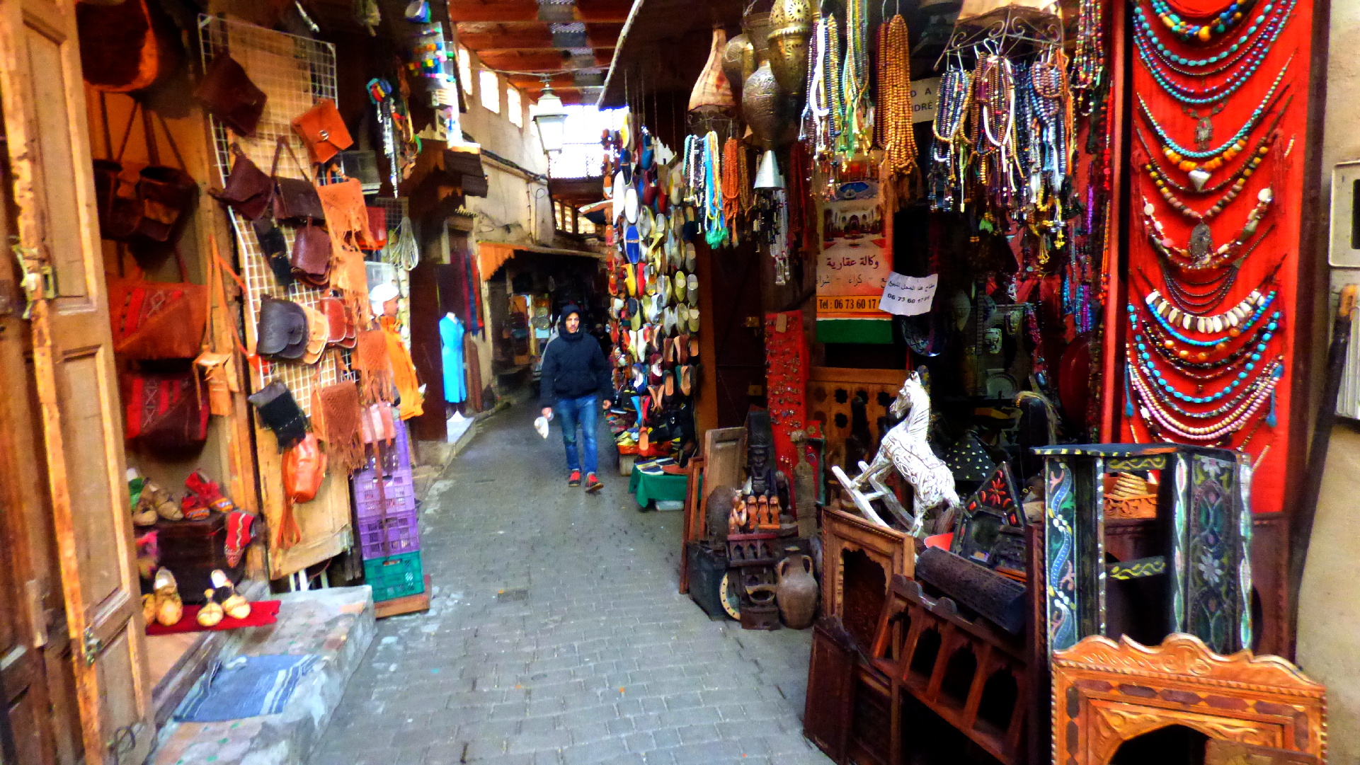 Aceptamos encantados su guía, se llamaba Mohamed (allí casi todos los hombres se llaman así, siendo el nombre más común) y nos dirigió por una calle que daba a la entrada de su tienda o de la cooperativa donde el era comerciante. Entramos porque nos dijo que tenía una azotea desde donde se podían apreciar las vistas a fez y a sus más que famosos, curtidores.