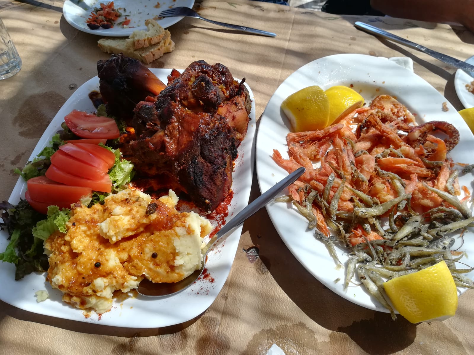 Nosotros nos decantamos la primera vez que fuimos por un pulpo (que dejan secando al sol previamente para después pasarlo por la parrilla) y una ensalada griega, todo fresco y sabroso. La segunda vez que paramos a comer cuando llegó visita, pedimos una parrillada de marisco (fritanga de gambas, calamar, pulpo y pescaito) y esta viene acompañada de un plato con pulpo a la vinagreta, diferentes quesos y ensalada. Pensábamos al principio que nos quedaríamos con hambre, ya que habíamos pedido una mariscada para dos y éramos cuatro, así que añadimos un plato más, cerdo cocinado a fuego lento, tan lento que la carta indicaba que para cocinarlo se necesitan 4 horas…