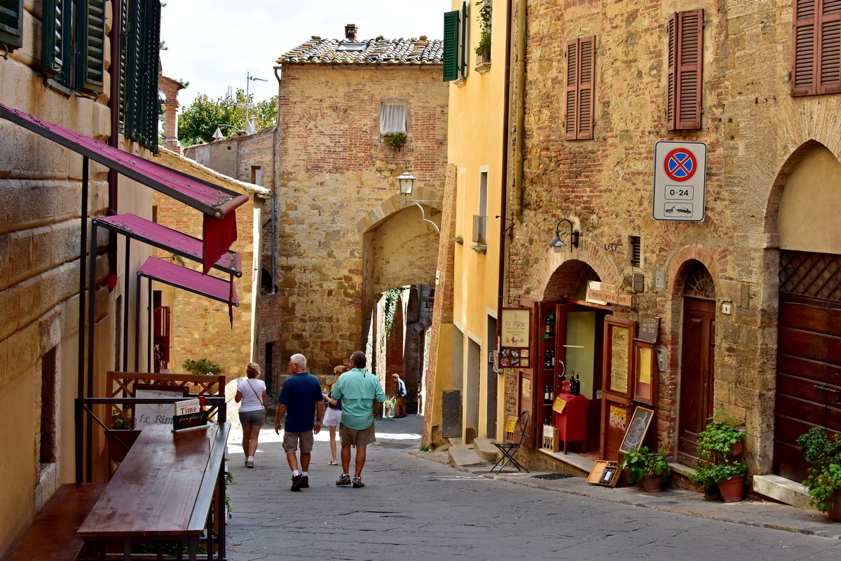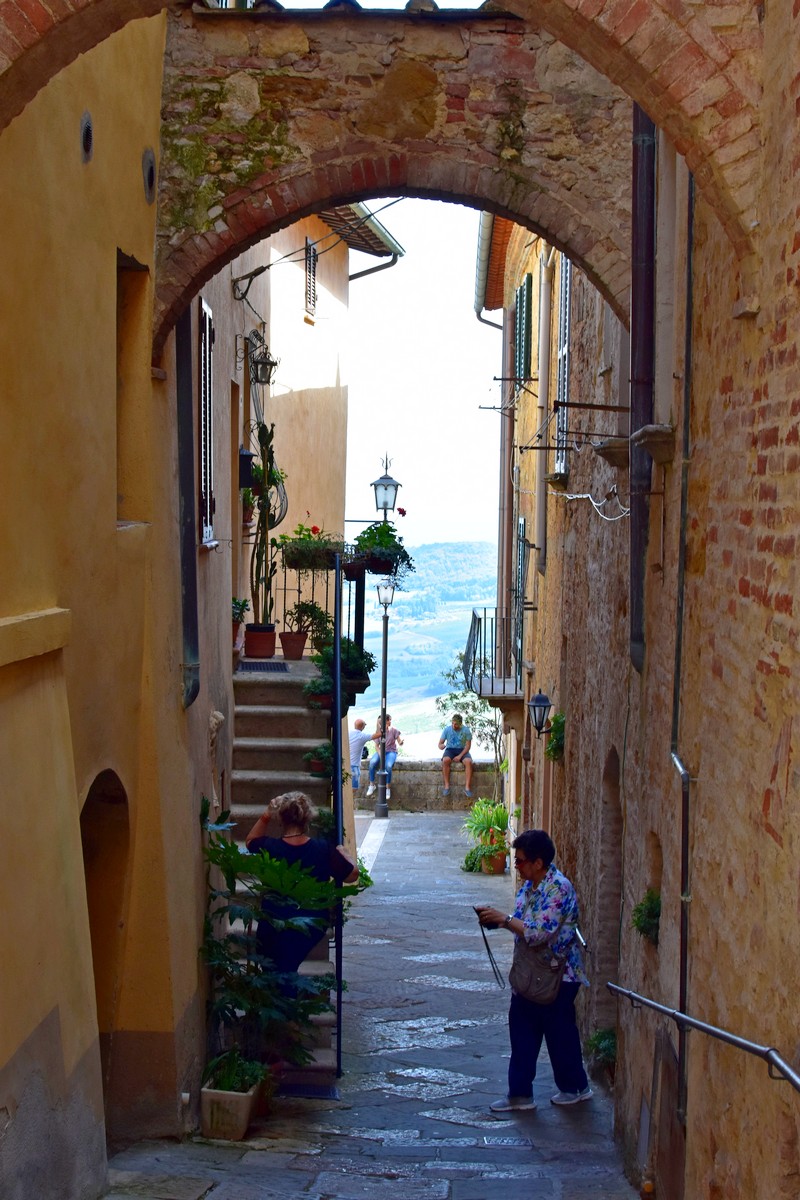 En Montepulciano callejuelas estrechas, arcos gigantes y altos edificios te dan la bienvenida, y el lugar también es conocida por el bueno vino que aquí se produce, se dice que entre Montepulciano y Montalcino está el mejor vino Toscano, uno de los mejores vinos de todo el planeta, respecto a los quesos se cree que los mejores son los de su vecina Pienza de donde proveníamos.