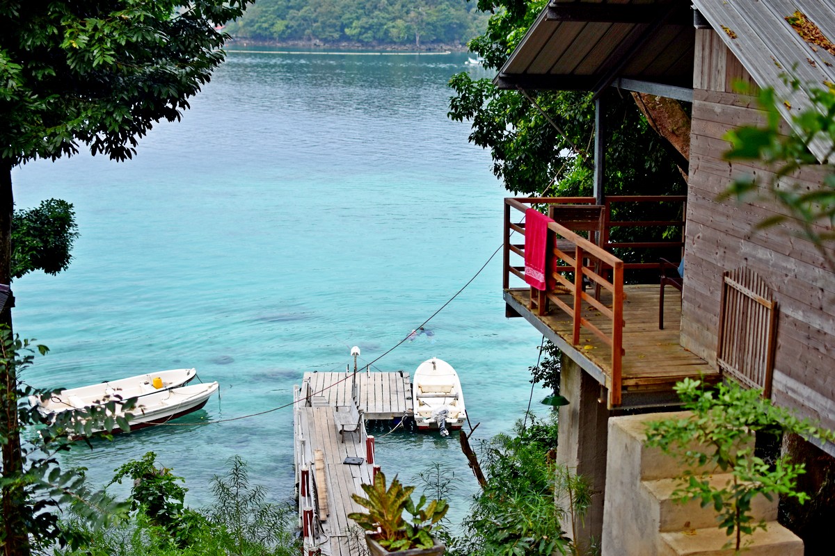 Paraíso porque es un lugar remoto, un espacio de jungla que contiene preciosas cabañas con espectaculares vistas a una fina lengua de agua de espectaculares colores verdes y azules totalmente transparentes, que divide este rincón de su cercana isla de Rubiah, de frente y a unos 500 metros de distancia.